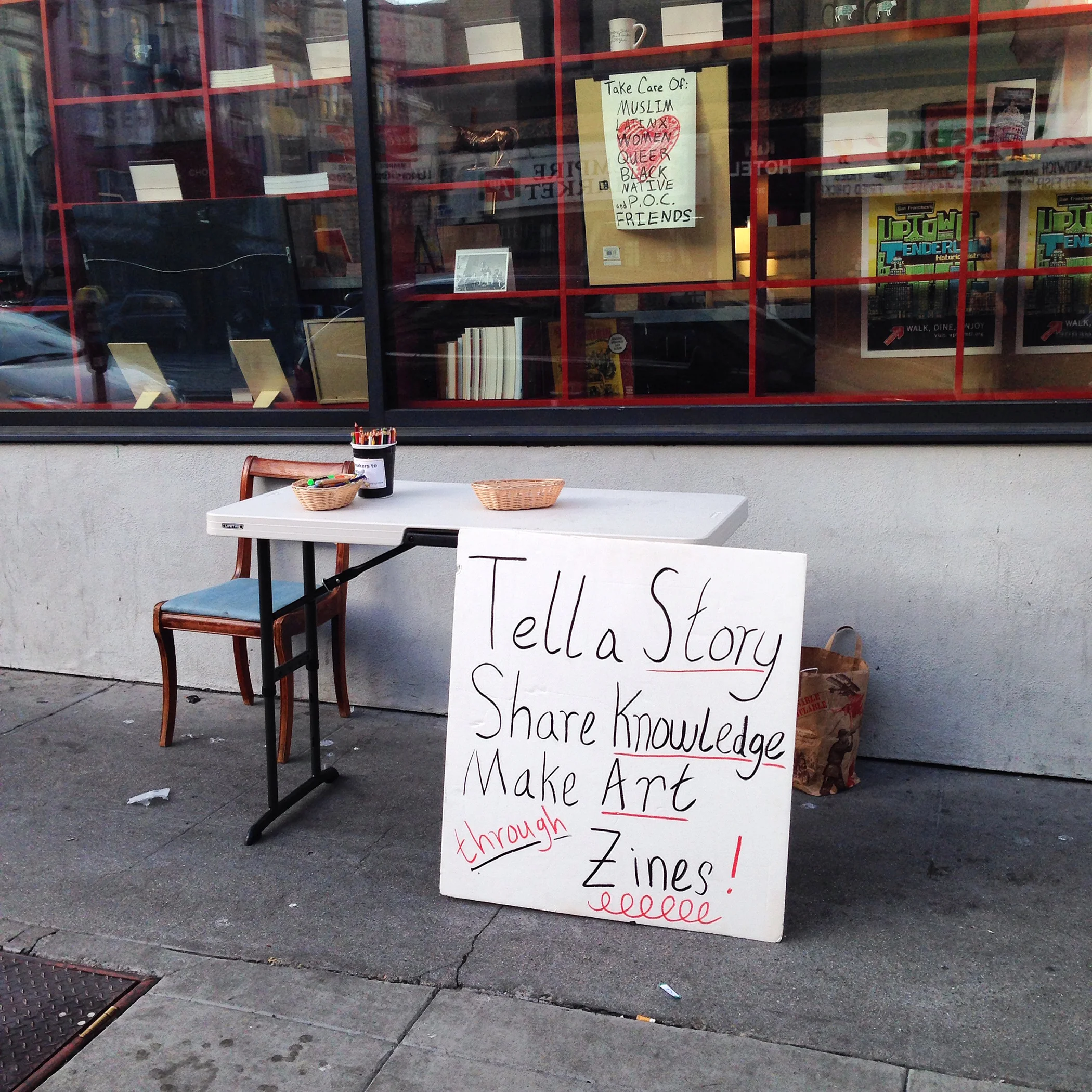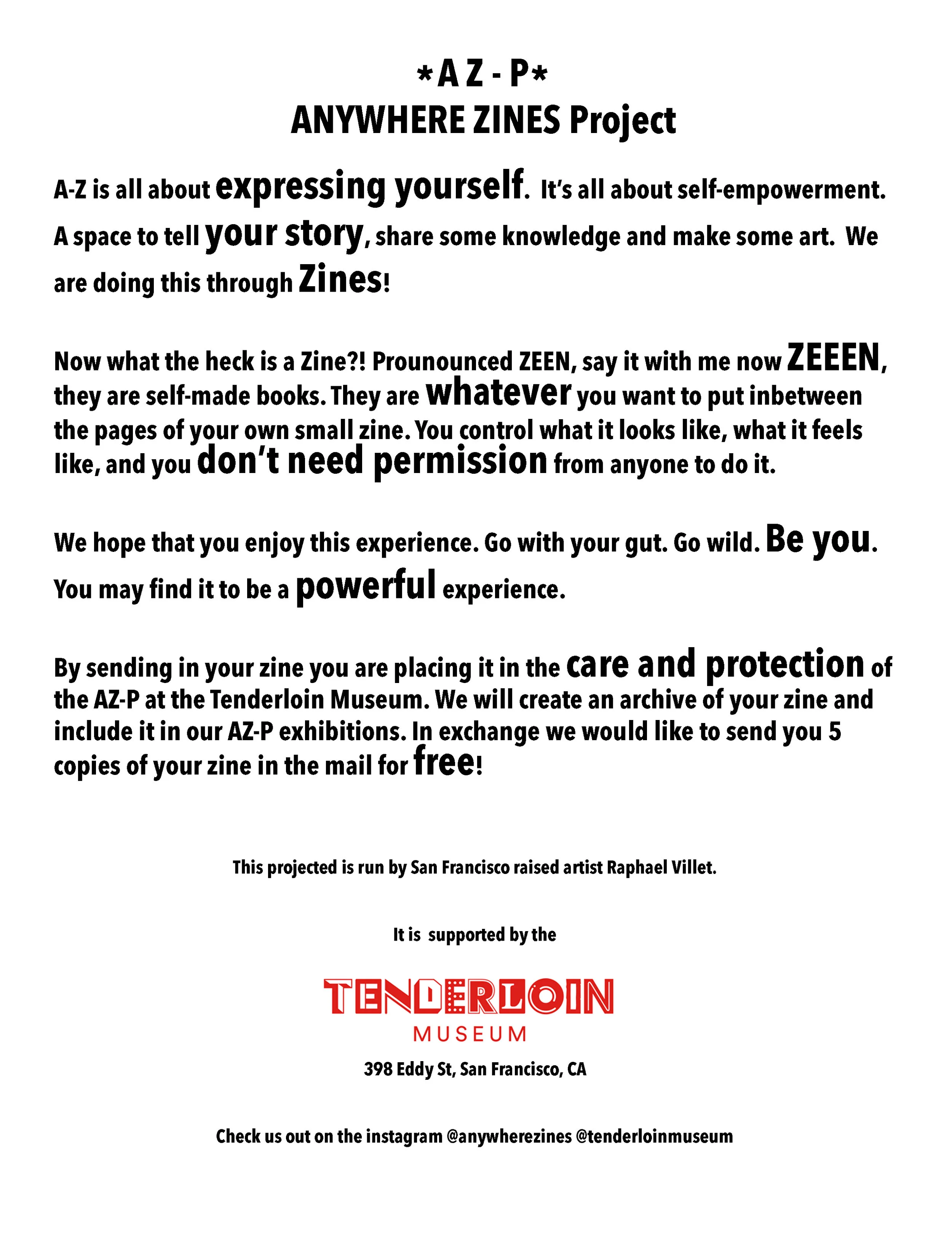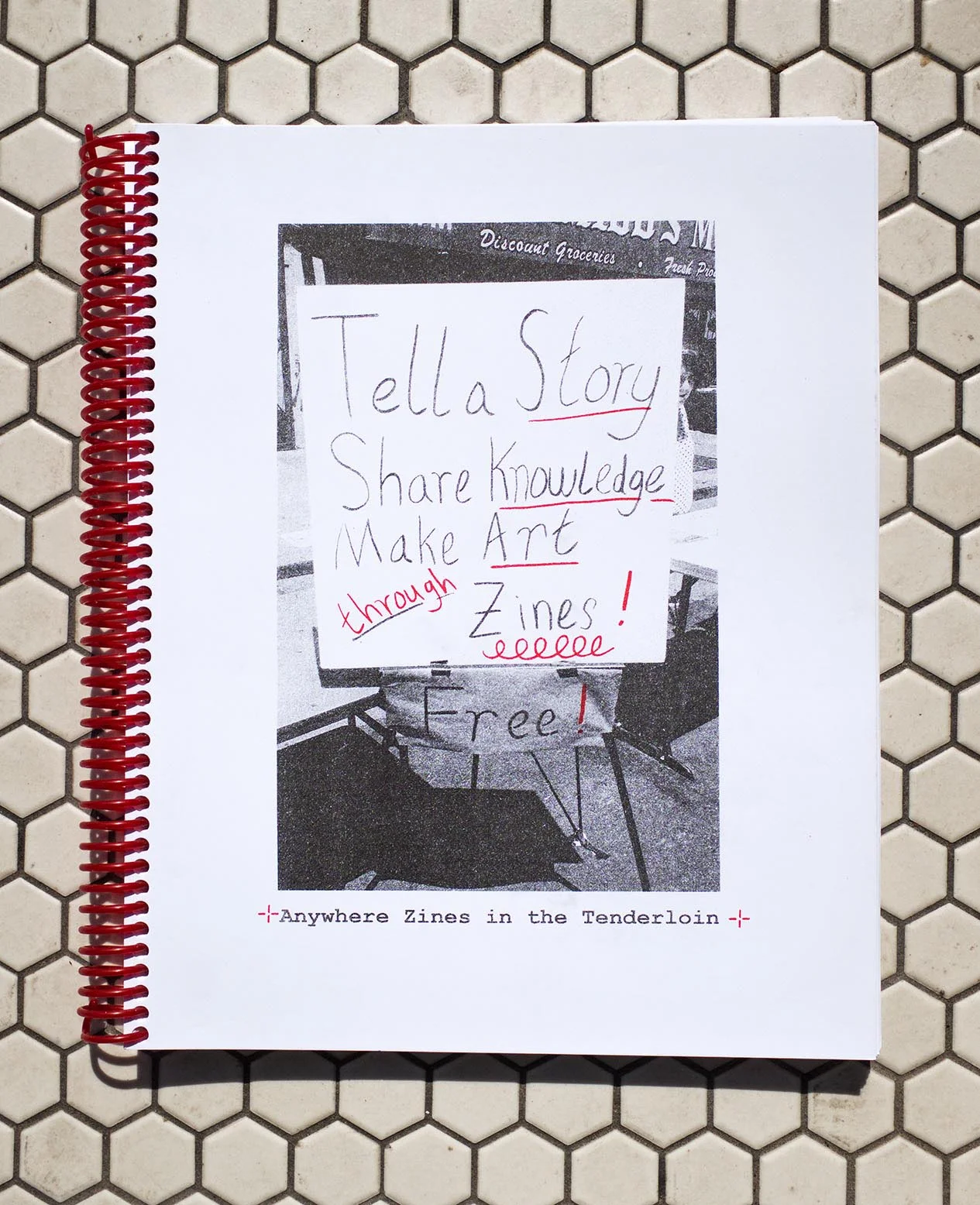 The project culminated in the printing of a book that serves as an archive of the 45+ zines made over 5 months on the street in the Tenderloin. More info can be found here.